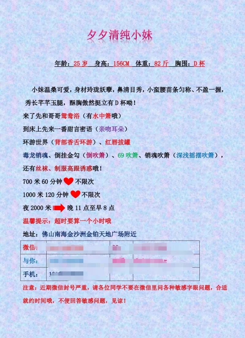 服务项目:鸳鸯浴,无T吹箫,毒龙,环游,口爆,胸推,制服丝袜